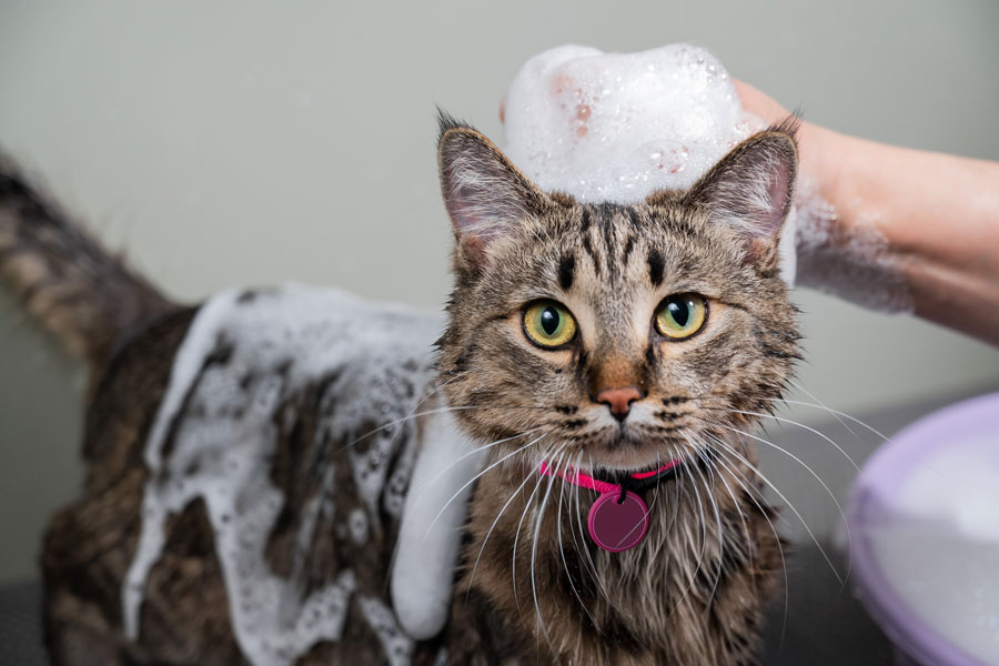 - Full water baths aren’t usually offered for cats; instead, dry methods and targeted trims are used to reduce stress.